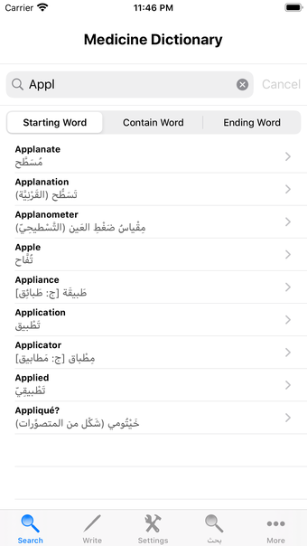 ميزة ملحوظة في قاموس الطب العربي هي ميزة "خيارات البحث"، التي تتيح للمستخدمين تحسين عمليات البحث الخاصة بهم. يمكنهم اختيار البحث عن الكلمات التي تبدأ بمصطلح معين أو تنتهي به أو تحتوي عليه، مما يوفر المرونة والراحة.